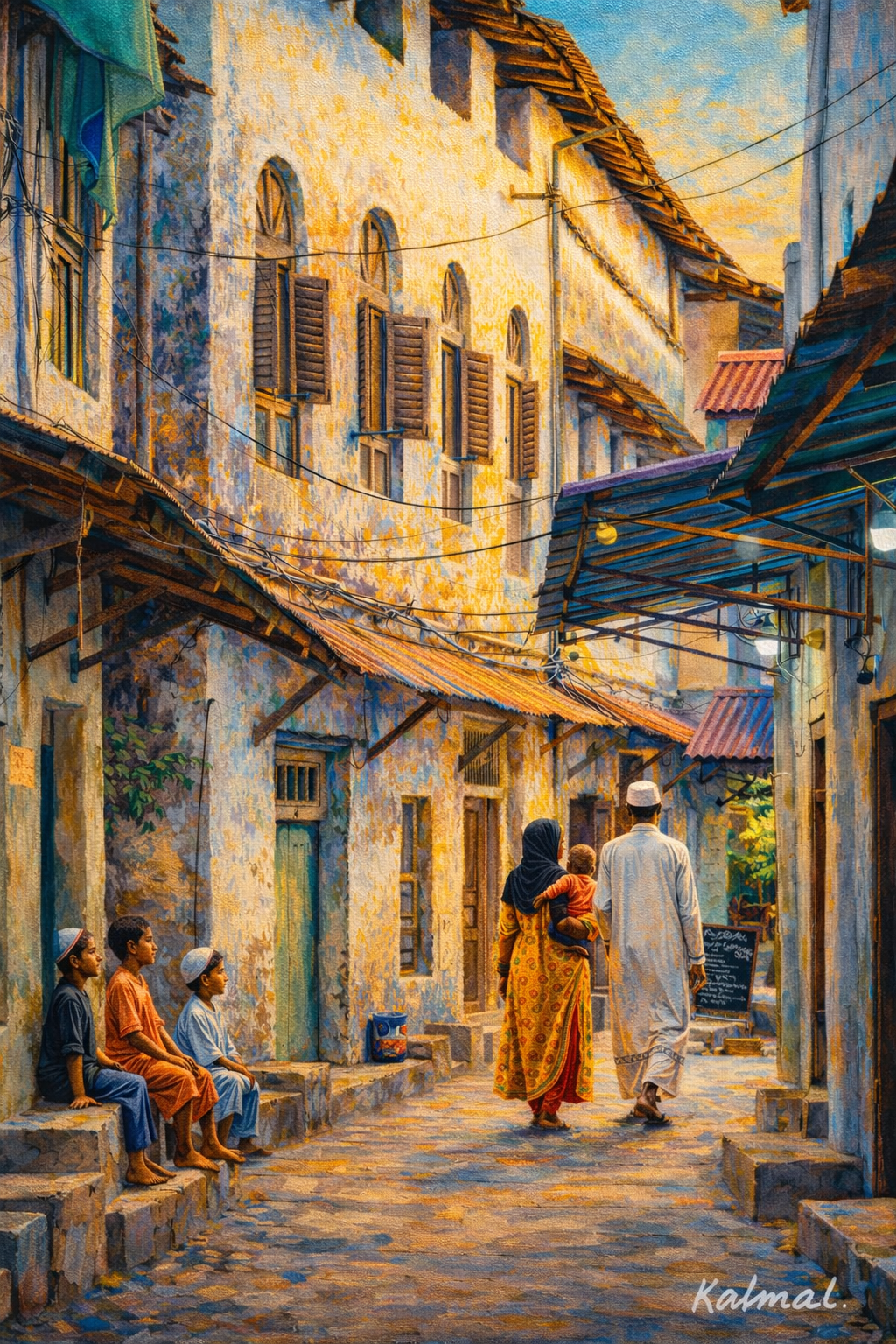 A narrow Zanzibar street at first light. The air still cool. Time moving slowly. Weathered walls carry decades of stories, softened by sun and salt. Children sit on the steps, unhurried, watching the world wake up. A family walks ahead, unspoken warmth between them. Nothing dramatic happens — and that is exactly the beauty.
