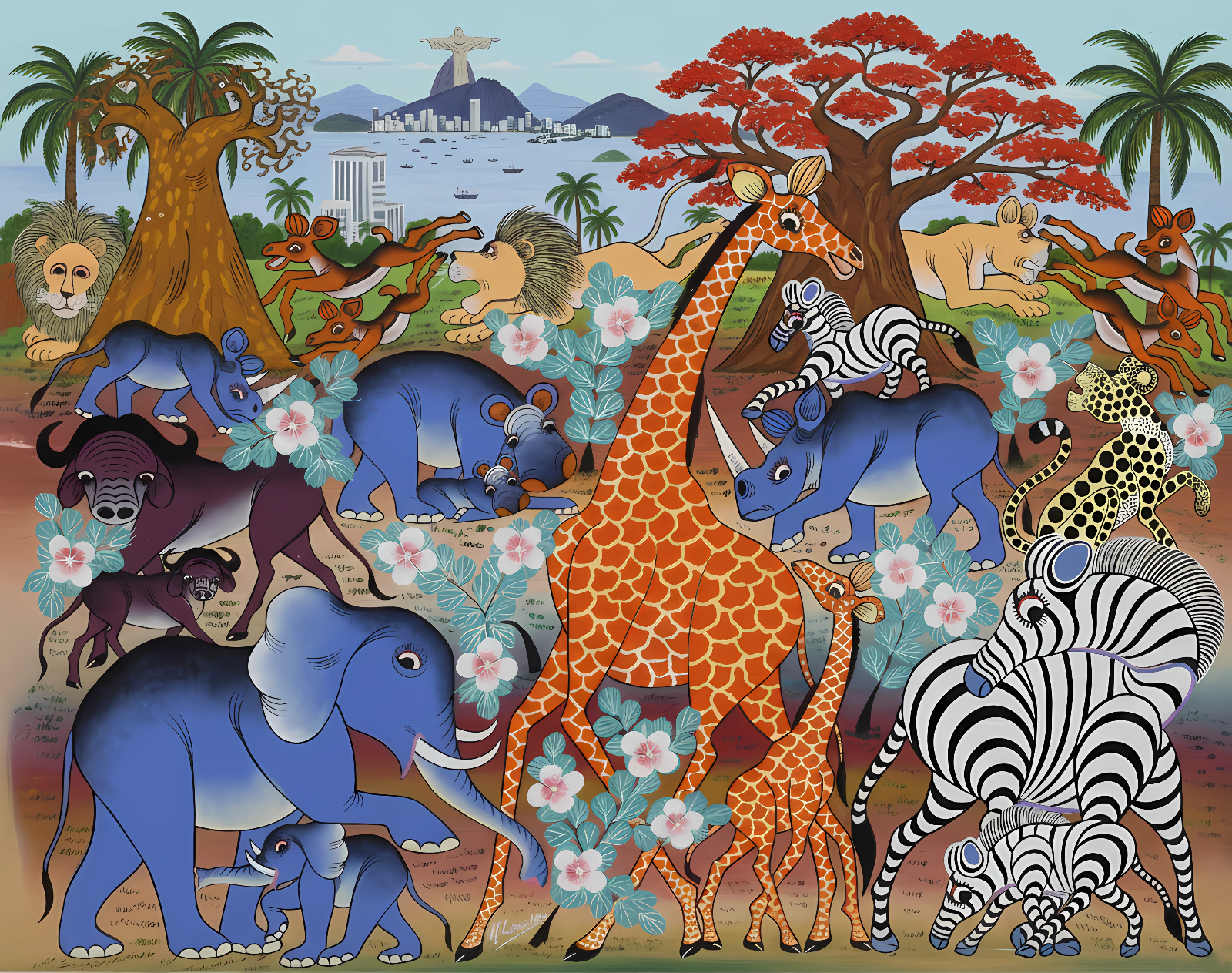Between Africa and Brazil lies the Atlantic, but in this painting the ocean does not divide—it connects. It carries memory. It carries names that were stolen, songs that survived, rhythms that crossed in chains and returned as culture. What was taken from Africa did not vanish. It arrived in Brazil and took root—in movement, in faith, in resistance, in joy.