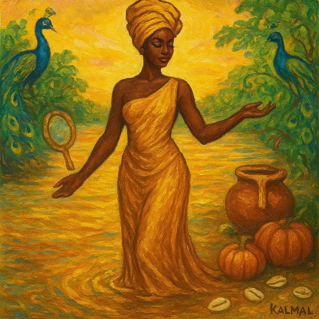 Clay vessels and gourds rest nearby, grounding the scene in ancient African tradition. These symbols of nourishment, fertility, and sacred offerings remind us that true abundance is not only material, but emotional and spiritual as well. The mirror in Oshun’s hand reflects self-worth and inner truth—an invitation for the viewer to honor their own value.