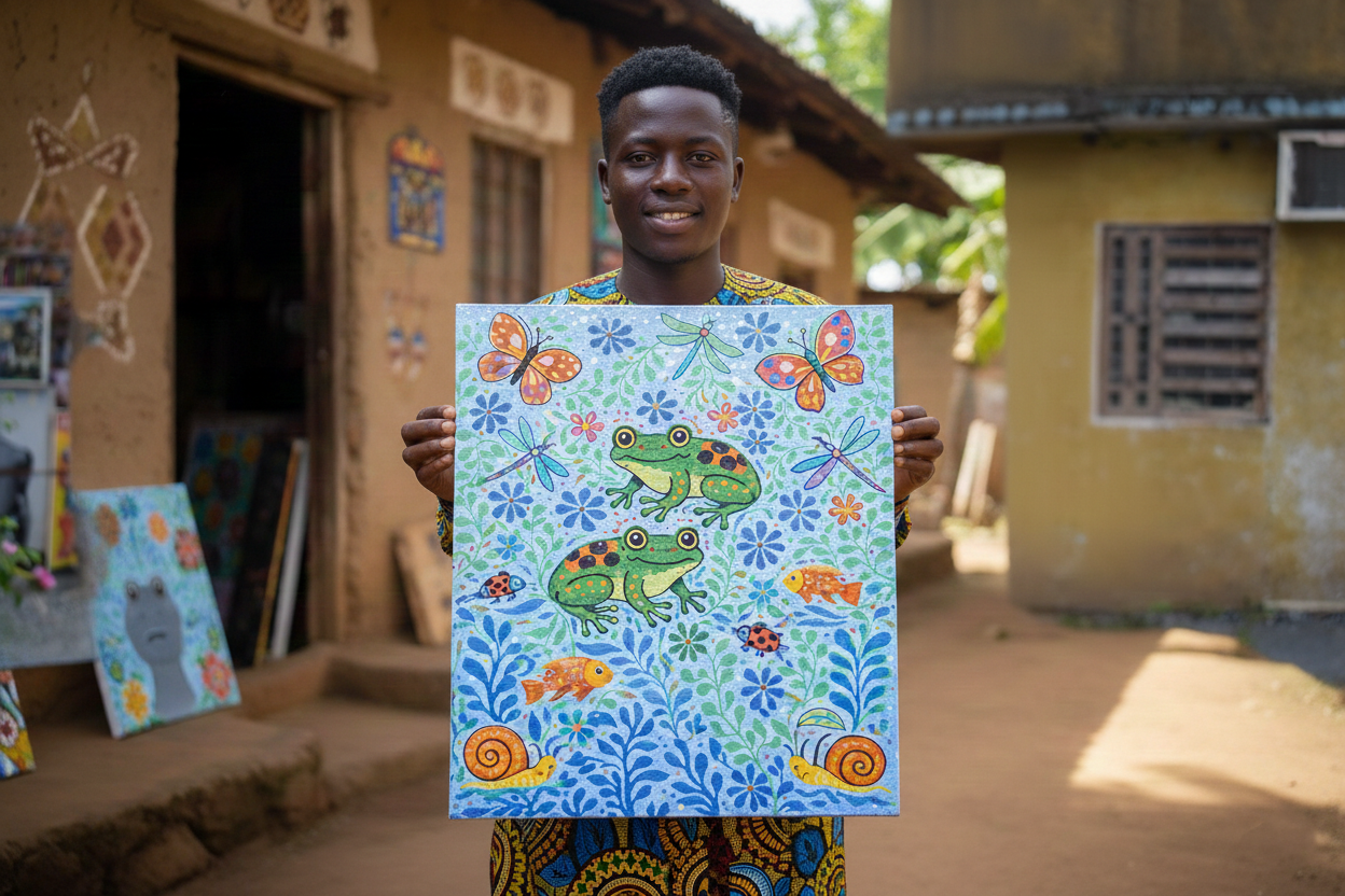 This artwork was hand-painted in Tanzania by a local artist, using acrylics on canvas in a folk-inspired style that celebrates harmony with nature. The slightly imperfect lines, visible brush texture, and joyful patterns are intentional — reminders that this is not a printed image or a digital design, but a human story told by hand.