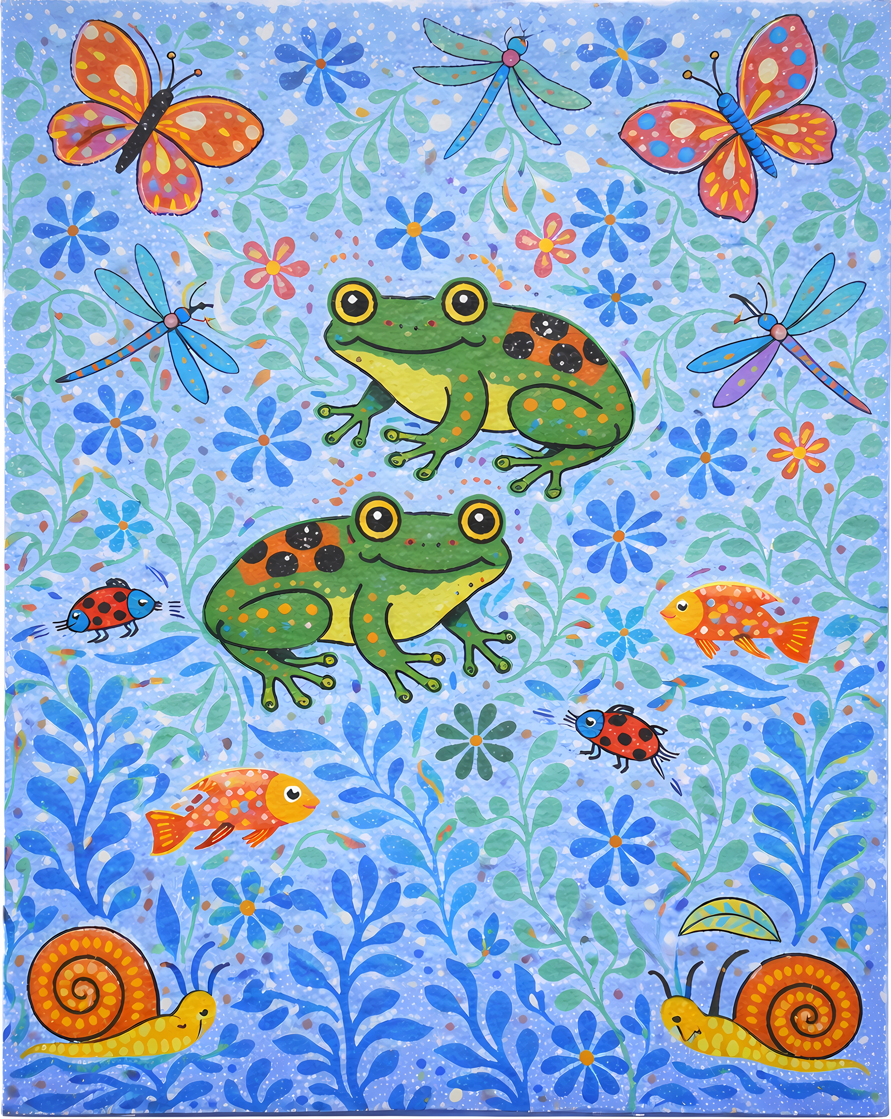 Two gentle frogs rest in a dreamlike blue garden, surrounded by butterflies, dragonflies, fish, snails, and flowering plants. Nothing rushes here. Nothing threatens. Every creature belongs. The dominant blue washes the scene in calm — like water, sky, and breath all becoming one.
