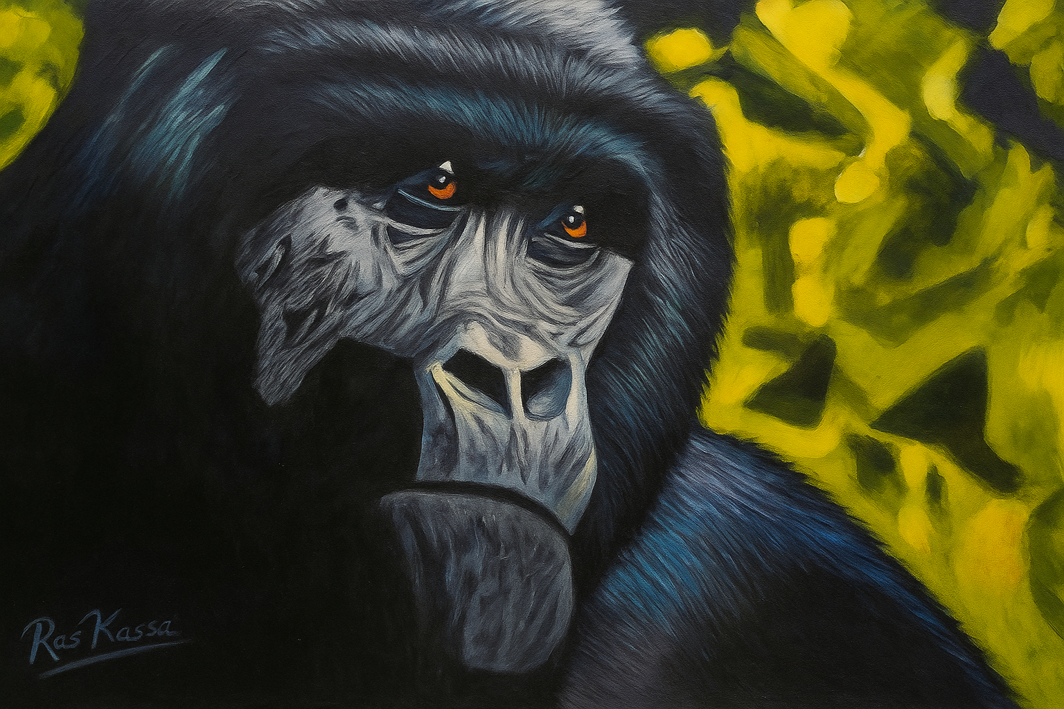 The gorilla is a symbol of Africa's natural beauty and biodiversity. It is a keystone species that plays an important role in maintaining the health of the ecosystem. The fact that the painting is set in Rwanda, a country that is home to one-third of the world's remaining mountain gorillas, adds to its significance. It reminds us that Africa is a place of great natural wealth and beauty.