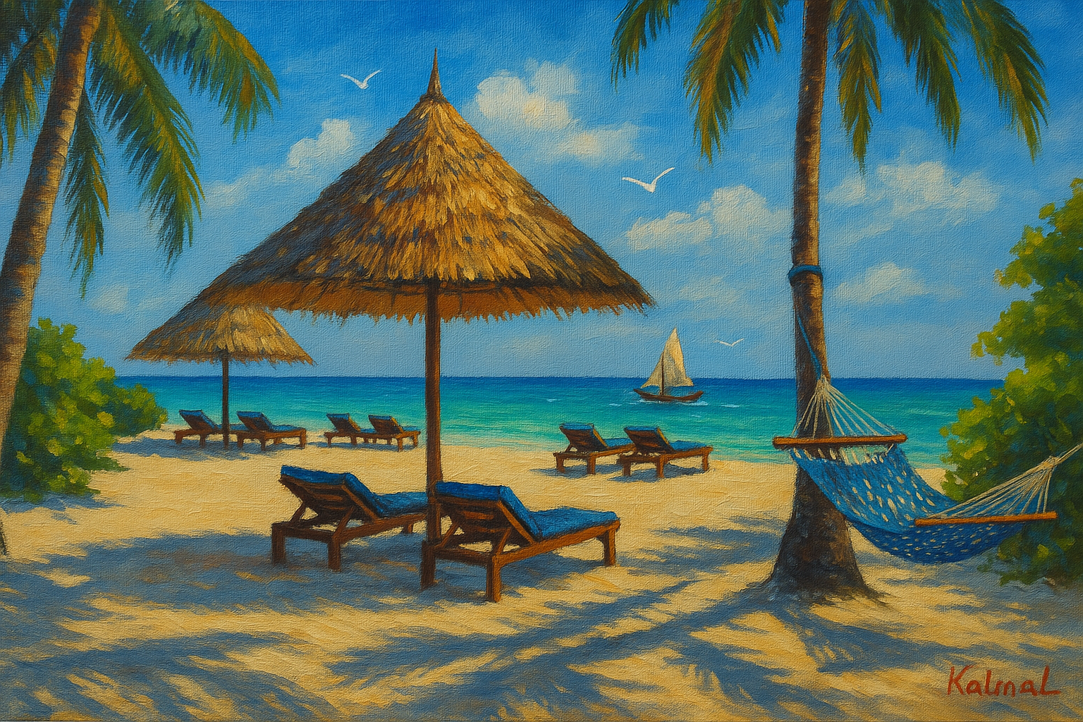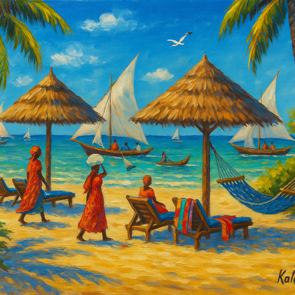 The warm color palette of golden sand, azure waters, and vibrant corals and oranges creates an inviting atmosphere that transports viewers to this East African paradise. The artist's attention to detail in depicting both the natural beauty and cultural elements makes this piece a captivating representation of Zanzibar's unique character.